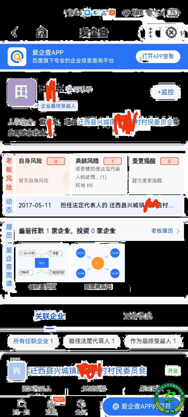 爱企查显示,迁西县兴城镇某村村民委员会法定代表人为田某东,同时担任迁西县兴城镇某村股份经济合作社法定代表人。