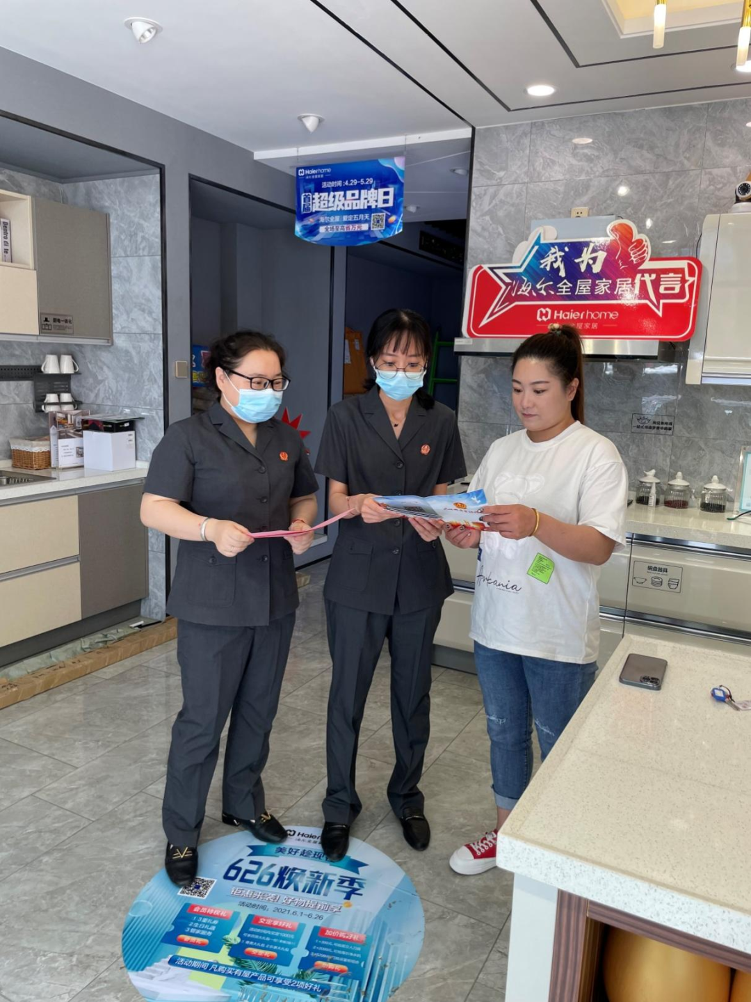 活动中,干警走进沿街商铺,挨家挨户上门开展普法宣传,为店家、顾客发放《民法典》宣传手册与《森林防火安全知识及法律法规宣传》宣传单。在交流过程中,干警讲解简单的法律法规知识,针对有法律疑问的现场予以解答,告诫商户要学法懂法,守法经营,同时借此以商铺为宣传平台,也让更多的居民群众接触和了解人民法院的工作,以正确的维权途径,保证法律权益免受侵害。