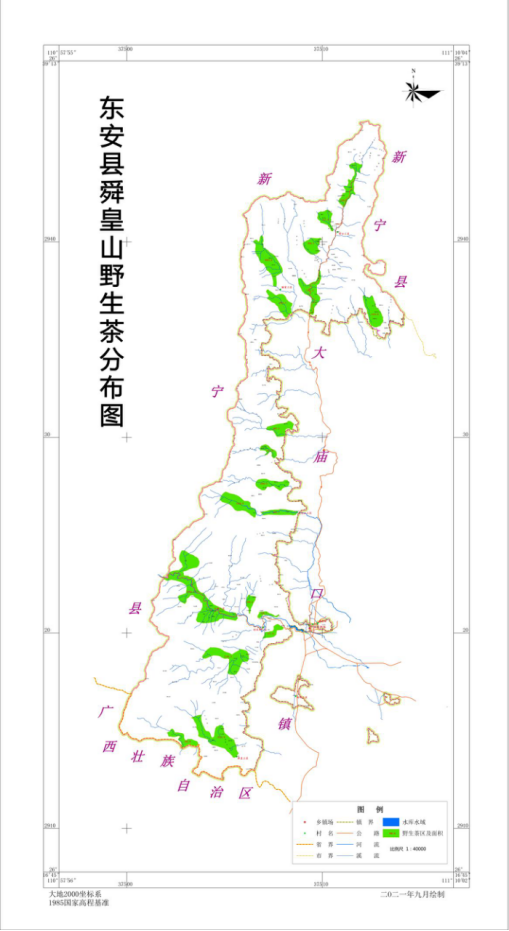 高山野生茶分布情况。东安县境内野生茶叶分布广、面积多,分布密度较大的区域在舜皇山国家级森林公园。舜皇山地貌呈“三山夹二谷”之势,有近10万亩野生茶林,是中国乃至世界面积最大的野生茶林,其中核心区域达25409亩。东安茶叶发展历史悠久,当地农民自古以来就有种茶、制茶、饮茶的传统,各乡镇野生茶林面积广,分布野生茶的山地超过10万亩,现有规模连片高山野生茶园3.2万余亩,主要分布在大庙口、横塘、石期市、川岩、黄泥洞、新圩、花桥、大盛等乡镇。