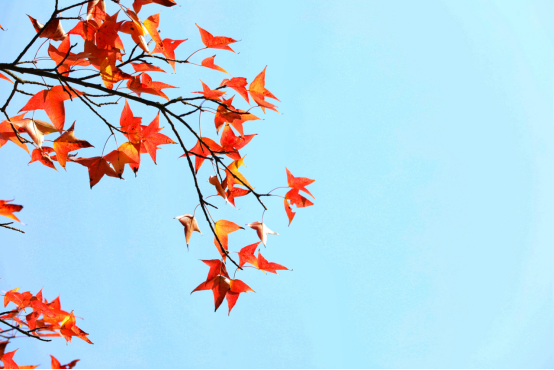 枫叶变红是由于花青素的作用,渐渐地叶子内水分全部蒸发,红叶慢慢枯黄却又是另外一种美。