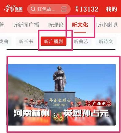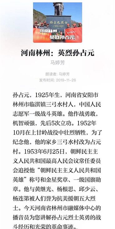 《河南林州:英烈孙占元》2019年11月26日被“学习强国”河南省学习强国平台选用刊发,2019年12月3日被“学习强国”全国学习平台电台听文化专栏选用刊发,一经发布,便引起强烈反响,受到听众的一致好评。