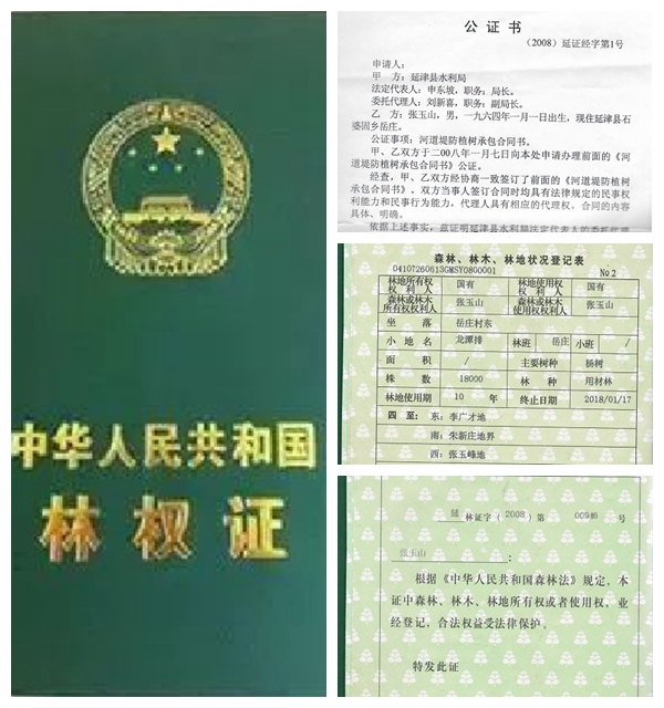 张玉山承包堤防植树与政府部门签有合法合同,栽植的树木有政府颁发的印有烫金国徽和"