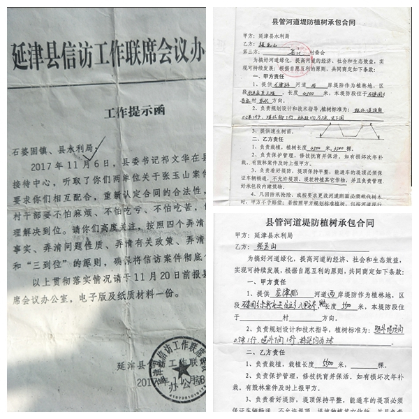 2004年3月,延津县水利局将县管河道龙潭排河两岸河堤对外承包植树。同月22日,张玉山与县水利局按照三个承包区段签订三份《县管河道堤防植树承包合同书》,承包延津县水利局龙潭排河道两岸堤防林地栽植树木。承包区段分别为岳庄村东南方向朱辛庄村地段至北王庄村地段、岳庄村东北方向北王庄村地段至王堤村地段、北王庄村正东方向岳庄村地段至岳庄村地段,承包期限为10年。