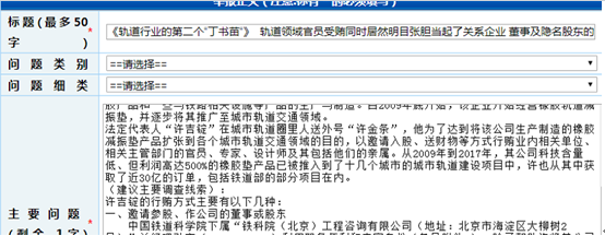 中国铁道科学院下属“铁科院(北京)工程咨询有限公司负责人利用职务便利和专家身份,除了帮助天铁公司将产品的减振效果虚构提高了1倍,还通过关系帮助天铁出具了“深圳地铁试验线”的减振降噪效果报告书。为此,该负责人获得了天铁公司董事一职,(网搜可见)并还接受了约计90万元的40万股干股股份,借用许吉锭儿子“许孔斌”之名存挂在公司。
