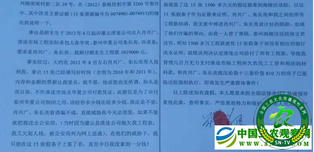 灌云县淮连市场空手套白狼害惨数百人阿阿阿连云港灌云县的顾东生、陈其莆、徐士品等多人投诉称,该县淮连农 副产品批发市场空手套白狼骗取千万资金建市场,建好市场后又采用金蝉脱壳手段逃避债务,导致三四十个分包人 被骗倾家荡产,数百个农民工拿不到工资 举报人顾东生讲述: 2011年5月,淮连肖兴广等人兴建灌云县淮连农副产品批发市场,张学艮为该项目的总包方,本人承建淮连市场的大理石铺贴工程。“完成工程量170余万元,可张学艮称建设方肖兴广欠他1600多万工程款没付 便不与我结帐,后经多次上访才从建设方肖兴广那里拿到70万元工人工资款,我又多次找肖兴广索要 ![]() 余款时,肖兴广却诱导我去法院起诉他才能付清我余款,张学艮的工程款钱只能走法院拿。”我按照肖兴广的授意把 淮连市场施工方张学艮和肖兴广告上了法庭,没想到开庭时,被告肖兴广称他已经付清了张学艮的全部工程款。 原来,张学艮在肖兴广的15张共计1600多万元余欠工程款收据签了字,其实没付一分钱。用一本票据一次性签了不 同日期无任何银行流水的1600多万元的15张虚假收据来欺骗法院,大额付款尤其是单位无银行流水,人皆共知这是 典型的非法伪造的虚假证据,而法官未经审查便采信了上述伪证直接轻率地作出了“淮连市场肖兴广已全部付清张学 艮工程款,不负有连带责任。”的判决。在庭审过程中,肖兴广说不清已付款项的来龙去脉,没有任何支付痕迹, 但 判决结果,这份判决书使几十名参与淮连市场建设的投资人、买房人以及上百口工人成为讨债无门的受害人,因为张 学艮也被肖兴广骗得穷困潦倒,也是受害人,他哪来巨额款子赔偿给我们。 同属参建淮连市场受害人潘海军、刘元高诉淮连市场一案中(2019苏07民终909案件)连云港市中级人民法院查证 并做出公正判决,“因淮连市场提供不出1千多万元的银行流水,没有实际支付工程款,承担举证不能的法律后果。”淮 连市场败讼。 ![]() 张学艮讲述(音像资料),“大约在2012年八月左右,肖兴广带人找到我,拿出15张已经填写好时间和金额的收据 让我签名,一共1600多万,收据内容是我收到肖兴广工程款,我不同意, 他们说你先开收据才能付你工程款啊,该 给你多少钱还是给你多少钱。其实他们一分钱都没有付给我,也没有任何相对应的银行走账流水,如果是现金,这 么大数额一天之内又是在哪个银行取的。没想到后来肖兴广把它作为支付完我全部工程款的证据。张学艮又说,除 去抵押给他的13套商铺,淮连市场还欠他八百多万工程款。如果房子不属于他的话淮连市场就欠他1千六百多万工 程款。 对此顾东升说,“我们有足够的证据证明肖兴广存在诈骗、虚假诉讼等犯罪嫌疑,我们多次到侍庄派出所报 案未果;灌云县公安局经案大队孙凤广则表示,上面领导不让办理此案。” ![]() 现年77岁的徐士品也是受害人之一,他带一帮人为市场建设做包清工,一共工资28万多元,肖兴广不付给张学艮 工程款、张学艮没钱付农民工工资,农民工把我告上法庭,退休工资被法院执行了,生活举步维艰。 ![]() 受害人陈其莆讲述,由于拿不到淮连市场的40多万工程款,他自己是债台高筑,天天有人上门要债,有家难回。 ![]() 受害人王小卫讲述:2011年5月,淮连市场无钱支付工程款和工人工资,将见好的十三套商铺房抵押给张学艮,冲抵 部分工程款。张学艮又将十三套商铺房抵押给供货商,或出售给他人。本人是建设淮连市场的混凝土供货商,张学艮 抵了两套商铺给我,已经用了十来年了,肖兴广却要将我赶出门, 弄得我寝食不安。 ![]() 徐士品等受害人认为,真的假不了、假的真不了,淮连市场肖兴广不仅有欺诈行为,还涉嫌拒不执行法院裁决、和 虚假诉讼行为,他们坚信,肖兴广精心设计的惊天骗局一定会被戳穿!肖兴广团伙一定会被绳之以法,同时此次政 法队伍教育整顿过程中,不作为、乱作为的“保护伞”也将被砸碎,为数百受害人讨回公道。 |