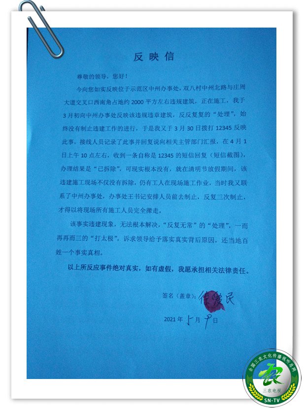 中经网河南讯 近期以来,媒体多次接到商丘市中州办事处双八村村民反映,位于示范区中州办事处,双八村中州北路与庄周大道交叉口西南角占地约2000平方左右违规建筑,是双八村村干部在占用村集体土地上建筑的,且没有任何手续,多次向中州办事处反映,反反复复的“处理”,始终没有制止违建工作的进行。