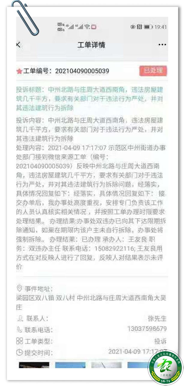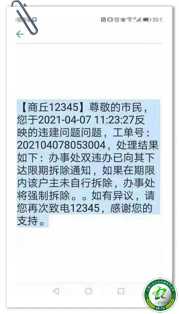 3月30日,拨打12345反映,得到的办理结果回复(短信截图)是“已拆除”,可现实根本没有。