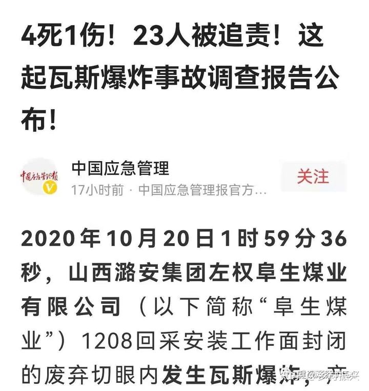 无独有偶,就在我们对潞安集团展开调查了解的同时,中国应急管理官方头条号发布了:关于山西潞安集团左权阜生煤业有限公司2020年10月20日1208回采工作面发生瓦斯爆炸致4死一伤!23人被追责的报道。(下为报道截图)