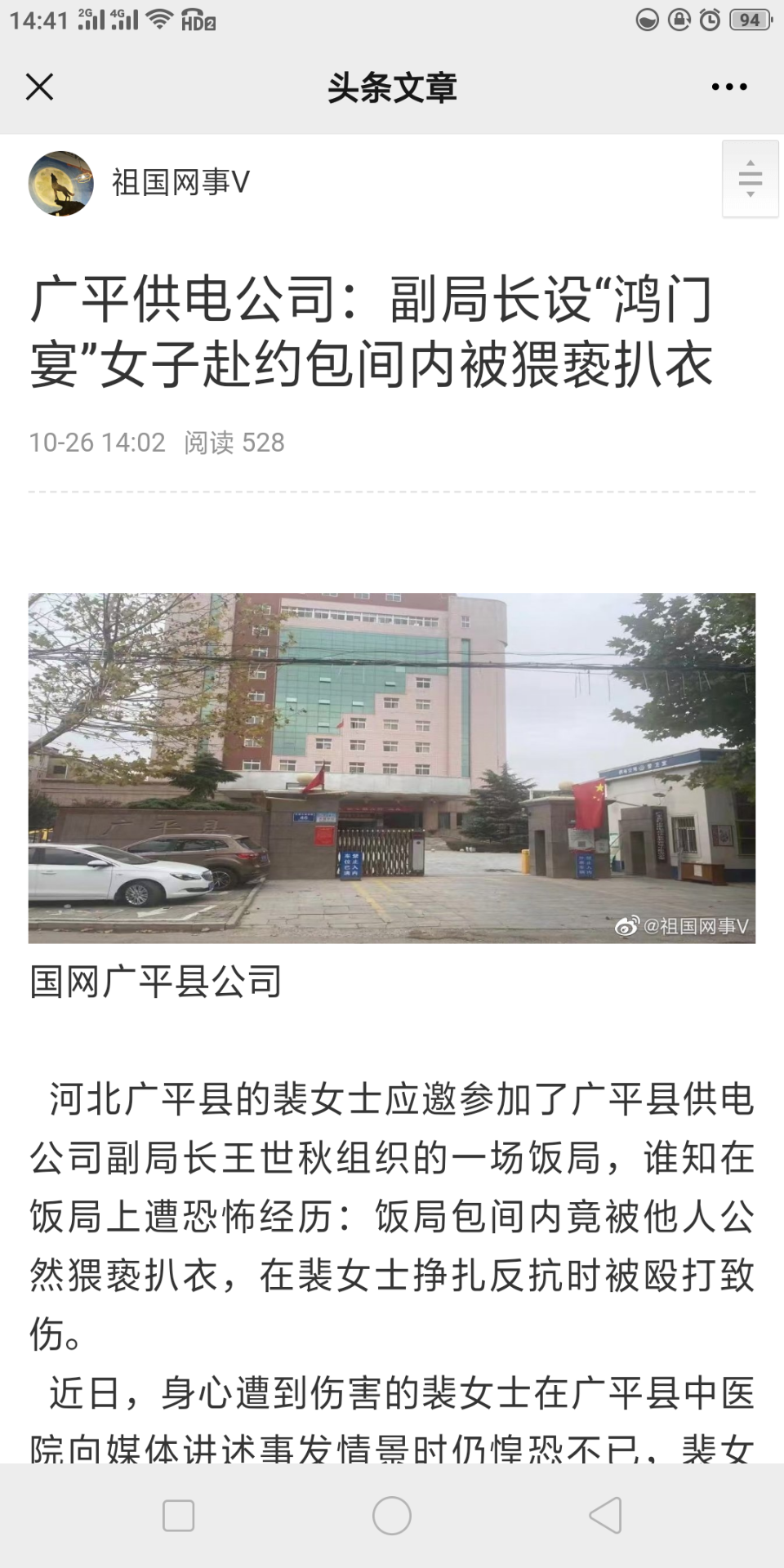 据了解,10月6日下午5点多,广平县供电公司职工焦晓玲打电话给裴女士说王世秋副局长约她去广平县鹅城家宴饭店一块儿吃饭。考虑到与王局长之前相识,裴女士就去参加了她们的饭局,没曾想这么一个平常的饭局竟成了裴女士人生中一段痛苦的经历。