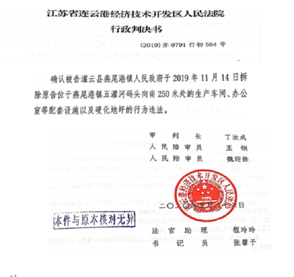 近期,江苏连云港经济开发区人民法院继依法判决灌云县燕尾港镇人民政府行政 违法后,又在今年8月10日判令燕尾港镇人民政府