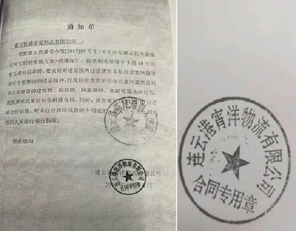 2021年11月17日下午,连云港市中级人民法院开庭审理了灌云县燕尾港镇人民政府行政违法赔偿案,庭审过程中,燕尾港镇人民政府代理律师为证明该镇没有违反强制拆除违建的法定程序,《通知单》显示,强制拆除前40天,该镇和连云港宵洋物流有限公司联合盖章向牧盛公司发出了通知。可宵洋公司相关领导表示,这份《通知书》是伪造的,称其公司压根就没有和镇里联合发出过这样的通知,并且说“你看,我们公司的合同专用章哪有这么小,一看就是假的。”