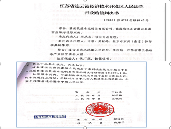2019年12月4日,灌云牧盛水泥制品有限公司向连云港经济技术开发区人民法院提起行政诉讼,请求法院判令灌云县燕尾港镇人民政府行政违法,赔偿因其违法强制拆除行为给灌云牧盛水泥制品有限公司造成的经济损失1700多万元。连云港经济技术开发区人民法院于 2020年5月26日作出“2019 苏 0791 行初 564 号《行政判决书》”,确认被告灌云县燕尾港镇人民政府于 2019年11月14日拆除原告位于燕尾港镇五灌河码头向南250米处的生产车间、办公室等配套设施及硬化地坪的行为违法。