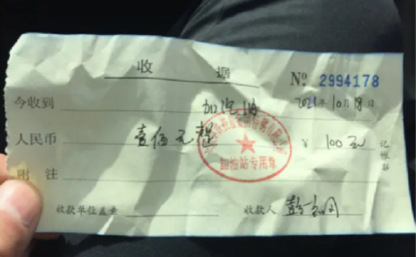 记者问工作人员可有汽油,她们说汽油只加95号的。记者为了获得证据加了100元95号汽油,并进行了录音录像,又让工作人员开具了该加油站的收据。