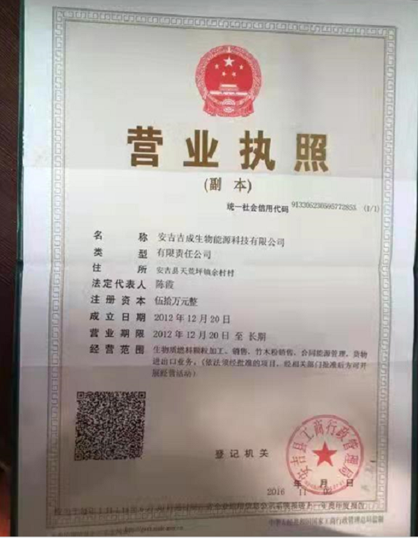 12月12日,余村村委会、安吉国土局天荒坪中心、天荒坪镇人们政府给我出具了一份厂房证明,上面清楚的写着:兹证明潘某某(我的房东)在安吉县天荒坪镇余村村有厂房一幢,面积600平方米,该房屋产权属于潘文革所有,情况属实。我12月20日,我拿到了安吉吉成生物能源科技有限公司的营业执照。