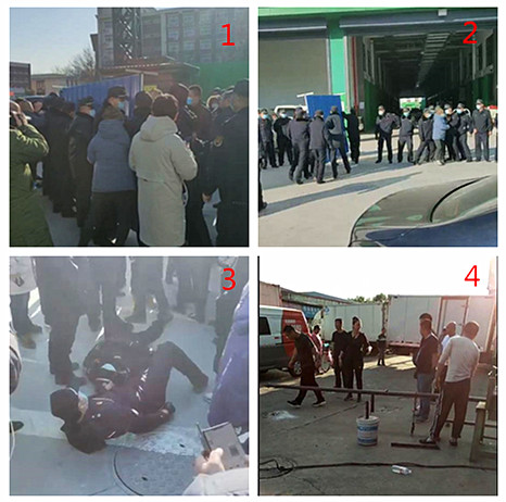 证据2:上图1图2天津市相关部门组织执法人员进场拆违阿米玛玛何庄子农产品批发市场时,多个视频材料显示,然而被暴力抗法,冯丽手下将多名执法民警和执法人员打倒在地,一名打手扬言随时喊一车人来。冯丽等人私自撕毁拆迁公告,将大门打开继续经营,致使执法人员无法执法,造成了国有和集体财产再次流失。这幕后究竟有何种力量在支撑着违法犯罪?图3为冯丽指使手下对抗执法人员,多名执法人员被打倒在地,而后却无人被追究刑事责任。图4为冯丽在现场指挥手下人员拆除老市场围栏,存放26个集装箱用于出租敛财等违法犯罪行为,报案半年后才搬走。冯丽指挥手下人员暴力强占市场,威胁商户,扰乱市场合法经营,在老市场内非法存放集装箱、暴力锁大门、断水断电等违法行为的事实。冯丽等违法人员至今仍逍遥法外。知情人讲述,冯丽曾在镇政府公开扬言:我要出事,你们谁也跑不了。吓的在场人员敢怒不敢言。