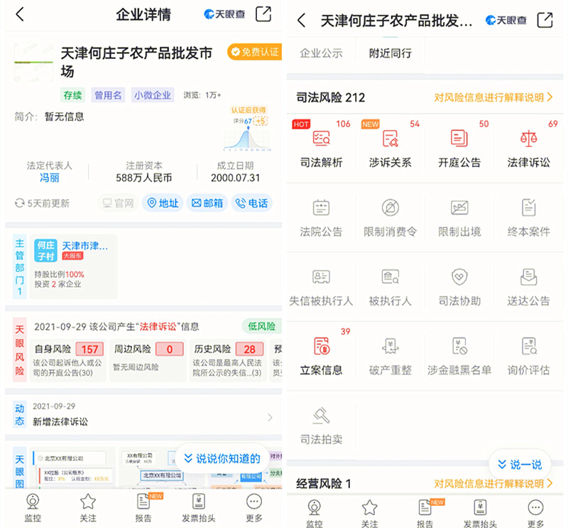 证据4:据天眼查显示,天津何庄子农产品批发市场(阿米玛玛何庄子农产品批发市场),法人代表冯丽,司法风险显示212条,司法解析106条、涉诉关系54条、开庭公告50条、法律诉讼69条、立案信息39条。拖欠工程款、拖欠农民工工资、拖欠村民工资、拖欠材料款、拖欠村民保险、非法买卖集体土地上的房产等违法行为,藐视法律,对抗执法人员,如此行为可见不一般!