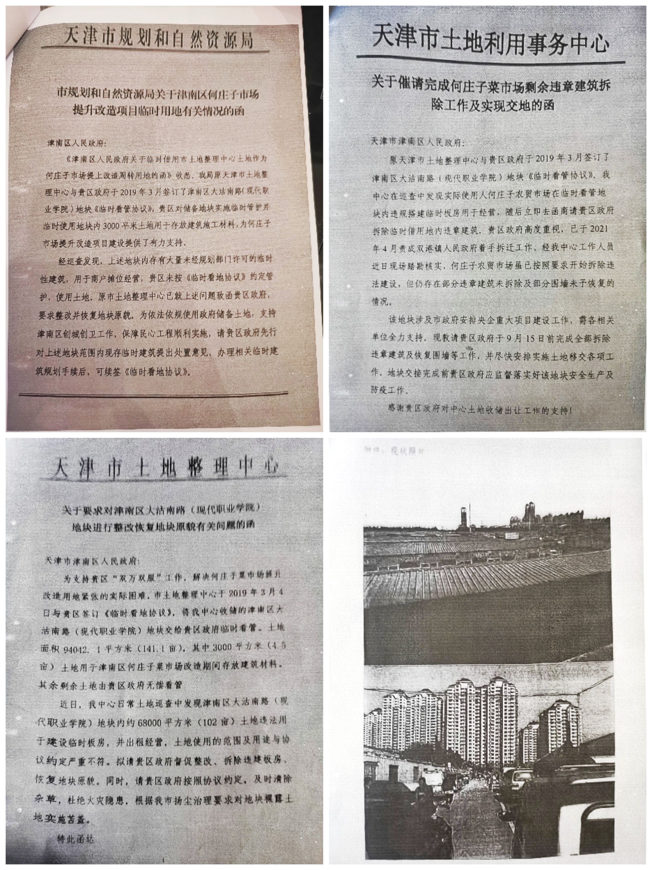 证据1:据政府文件显示,天津市津南区大沽南路(原职业学院)被冯丽等人非法侵占国有土地102亩,建设房屋近7万平米,非法获利数亿元。谁分了国有资产盈利的款项?谁又故意瞒报和支持违法犯罪的行为?2019年至2021年期间,天津市土地整理中心、天津市规划和自然资源局、天津市土地利用事物中心多次向津南区人民政府下达整改恢复地块原貌的函件,均被无视。导致该地块涉及央企重大项目不能落地,给天津市国有资产造成严重流失等违法犯罪的事实。