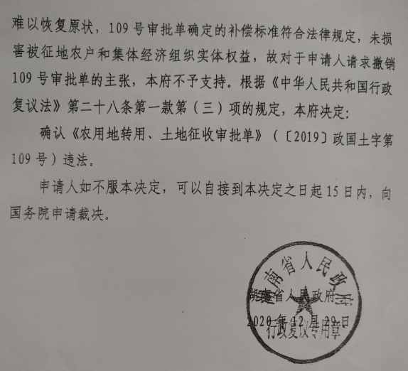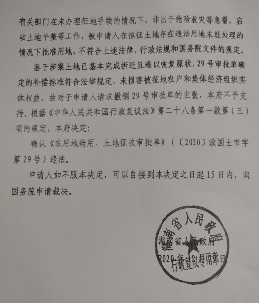 2020年12月,湖南省下达了行政复议决定书,明确告知:望城区部门被征地集体经济组织以及村民小组组长对拟征收土地权属、地类、面积以及地上附着物等情况进行确认,拟征地现状调查结果未经被征地农户和地上附着物所有权人共同确认,拟征地现场调查确认程序不符合《关于深化改革严格土地管理的决定》:“对拟征土地现状的调查结果须经被征地农村集体经济组织和农户确认”的规定;湖南省在拟征土地存在用地未经处理的情况下批准用地,不符合根据规定:“未经批准或者采取欺骗手段骗取批准占用地的,由县级以上部门土地行政主管部门责令退还占用的土地,对违反土地利用总体规划擅自将农用地改为建设用地的,限期拆除在占用的土地上新建的建筑物和其他设施,恢复土地原状,对符合土地利用总体规划的,没收在占用的土地上新建的建筑物和其他设施,可以并处罚款;对占用土地单位的直接负责的主管人员和其他直接责任人员,追究其责任。