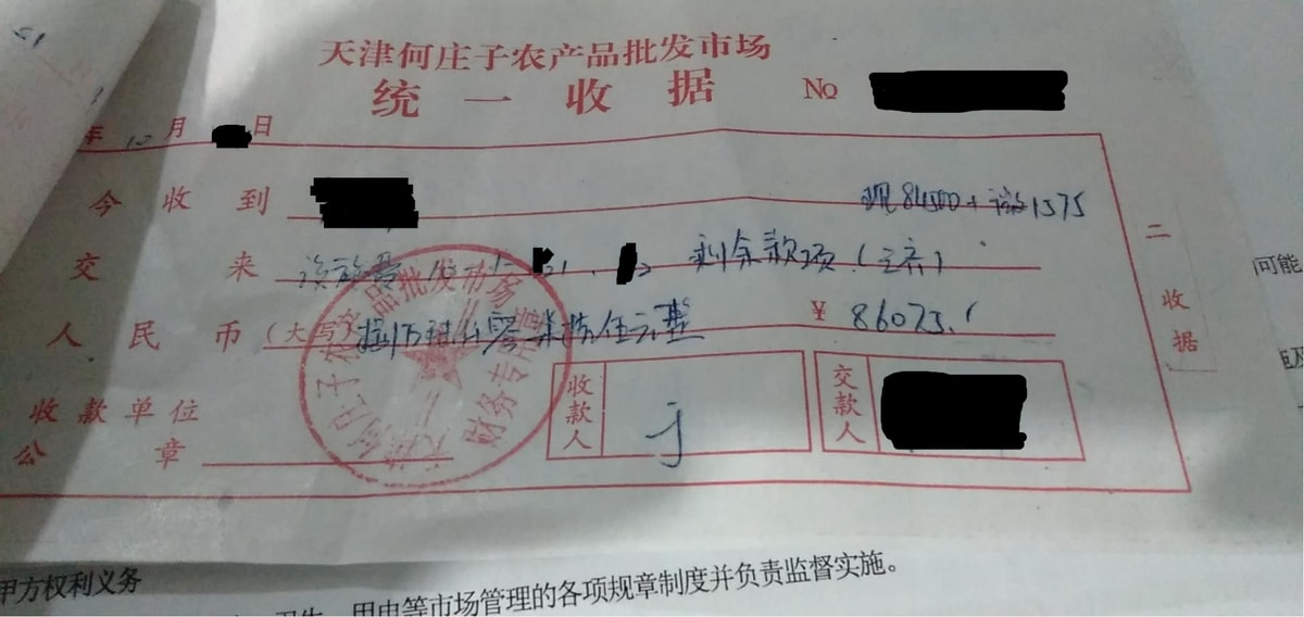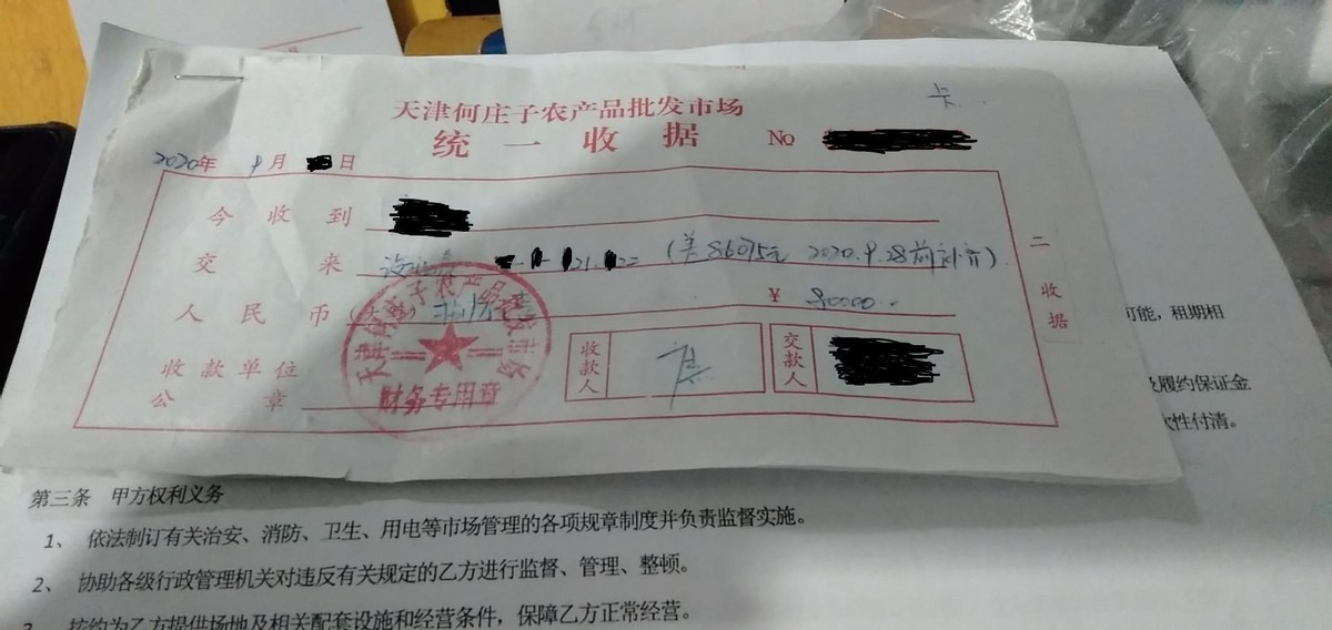 此前网友爆料了一份何庄子市场与入驻商户签订的租赁合同及收据,从该合同与收据的日期来看,何庄子市场出租的是上述违建板房。该合同显示,该违建板房70平方米的商铺一年租金为166075元。
