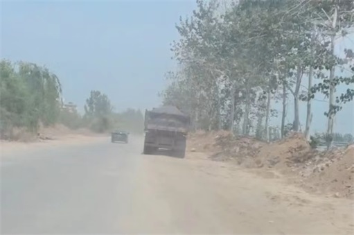 5月23日,本刊专程驱车赶赴曲周县进行了核实。在范庄村至第四疃村之间发现道路两侧断断续续多处堆积的土方和建筑垃圾全部未加苫盖。车辆经过时,路面上就扬起团团的的尘土遮天蔽日,使人难以行进。路旁耕地里的大棚上更是覆盖了厚厚的一层尘土。在现场发现一辆农用三马车和一辆垃圾转运车正在将车斗内垃圾和土方卸到道路两侧。