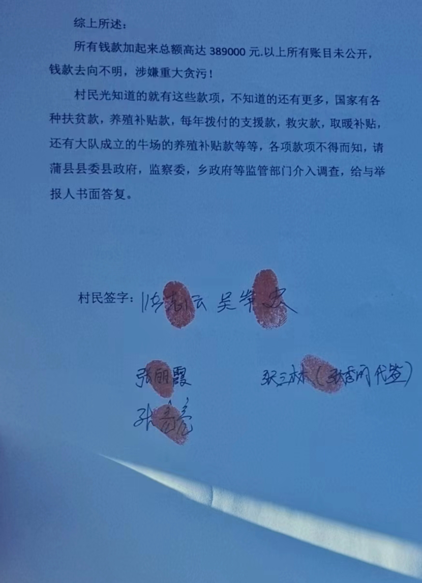 村民还反映,村民光知道的就有这些款项,不知道的还有更多,国家有各扶贫款,养殖补贴款,每年拨付的支援款,救灾款,取暖补贴,大队成立的牛场的养殖补贴款等等,各项款项具体多少?款项去向不得而知。