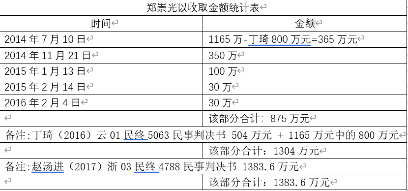 综合《中国青年网》《中国商报》报道,2010年云南企业家董学收购共同投资入股云南某房地产项目。2013年12月2日,董学和与郑崇光、林筱玲、丁琦签订《股份收购协议书》约定:郑崇光、林筱玲将股权转让给董学和,转让总价为5368万元——包含本金3520万元及利润1848万元。其中,郑崇光享有3868万元(本金2544万元,利润1324万元)、林筱玲1500万元(本金976万元,利润523万元)。
