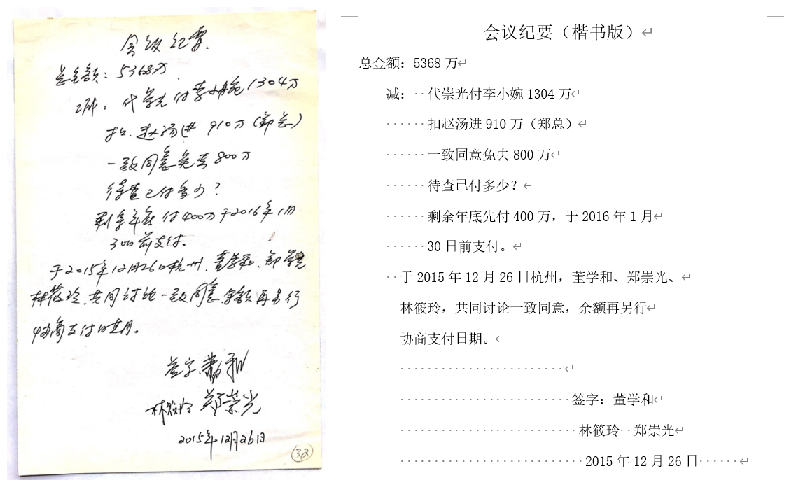 针对股份收购的履行,董学和与郑崇光、林筱玲三方2015年12月26日签署了最后一份书面文件--《会议纪要》: