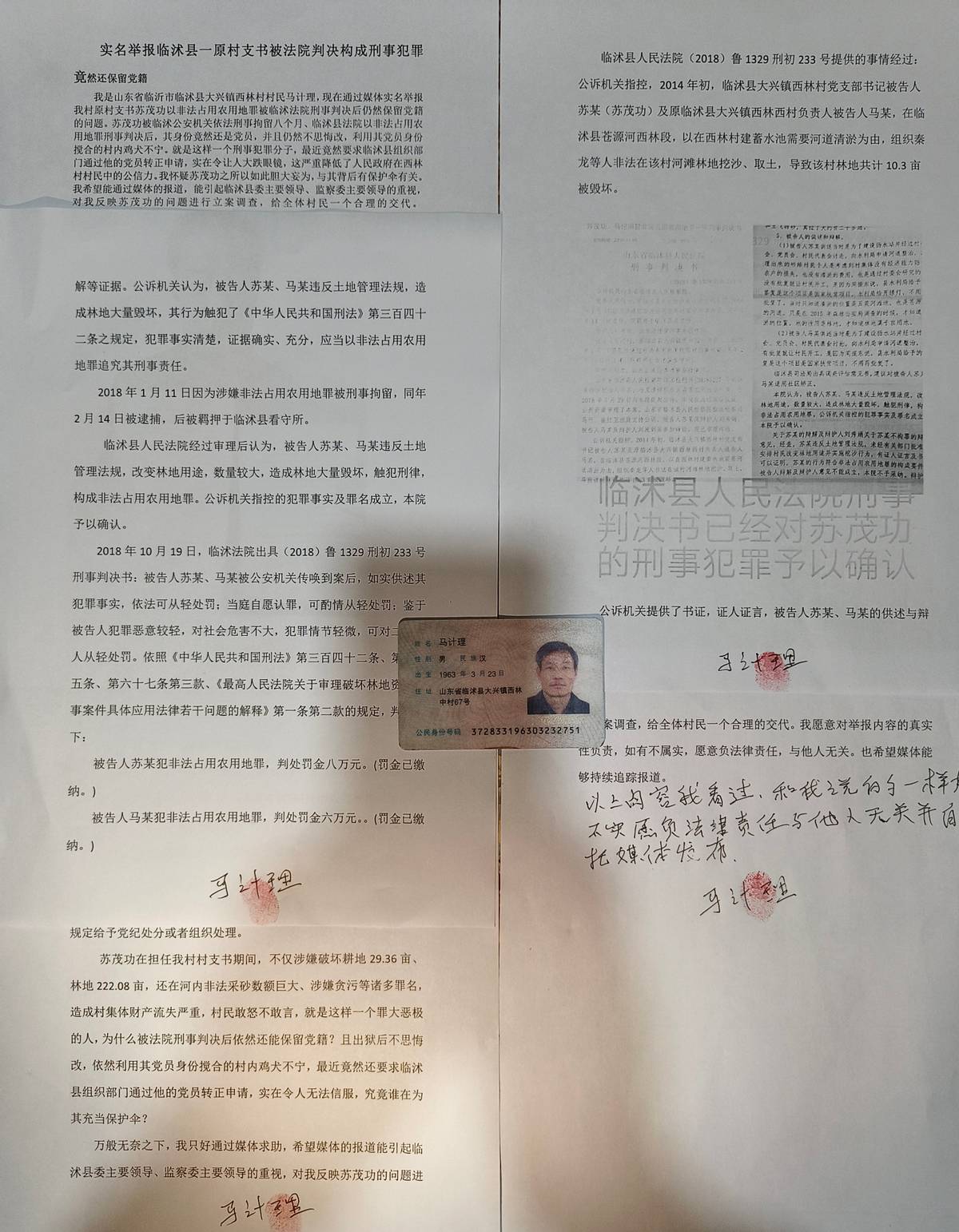 我是山东省临沂市临沭县大兴镇西林村村民马计理,现在通过媒体实名举报我村原村支书苏茂功以非法占用农用地罪被临沭法院刑事判决后仍然保留党籍的问题。苏茂功被临沭公安机关依法刑事拘留八个月、临沭县法院以非法占用农用地罪刑事判决后,其身份竟然还是党员,并且仍然不思悔改,利用其党员身份搅合的村内鸡犬不宁。就是这样一个刑事犯罪分子,最近竟然要求临沭县组织部门通过他的党员转正申请,实在令让人大跌眼镜,这严重降低了人民政府在西林村村民中的公信力。我怀疑苏茂功之所以如此胆大妄为,与其背后有保护伞有关。我希望能通过媒体的报道,能引起临沭县委主要领导、监察委主要领导的重视,对我反映苏茂功的问题进行立案调查,给全体村民一个合理的交代。