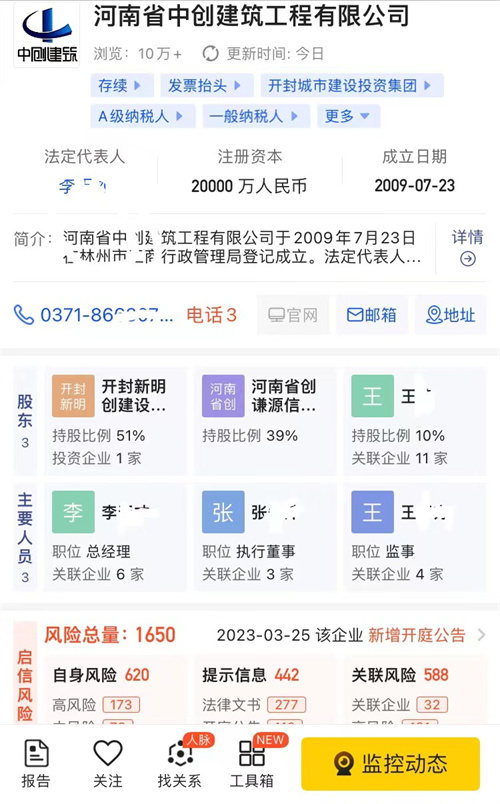网络查询显示公司简介: 河南省中创建筑工程有限公司成立于2009年7月23日,注册地位于林州市红旗渠大道与学院路交叉口林州建筑总部大厦A座11层,法定代表人为李某才,经营范围包括:建筑工程、公路工程......等内容。