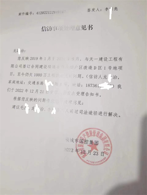 一份落款为:项城市国控集团,加盖公章为:项城市国有资产控股管理集团有限公司的信访事项处理意见书。签发人:李某亮,案件编号:412022122149167,载明龙某治:您反映2019年1月至2021年9月,与某一建设工程有限公司签订合同建设项城市门庄棚户区改造D区1号地项目,至今仍欠1000万工程款未支付问题。(信访人龙某治,家庭地址:交通东路某号附1号,电话:1873618****)我们于2022年12月21日受理,并发出受理告知书。