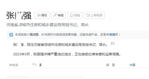 三农融媒据据法治在线消息:经过网络查询得知2023年3月30日,据清风周口消息:项城市住房和城乡建设局党组书记、局长张某强涉嫌严重违纪违法,目前正在接受纪律审查和监察调查。百科词条已更新消息。