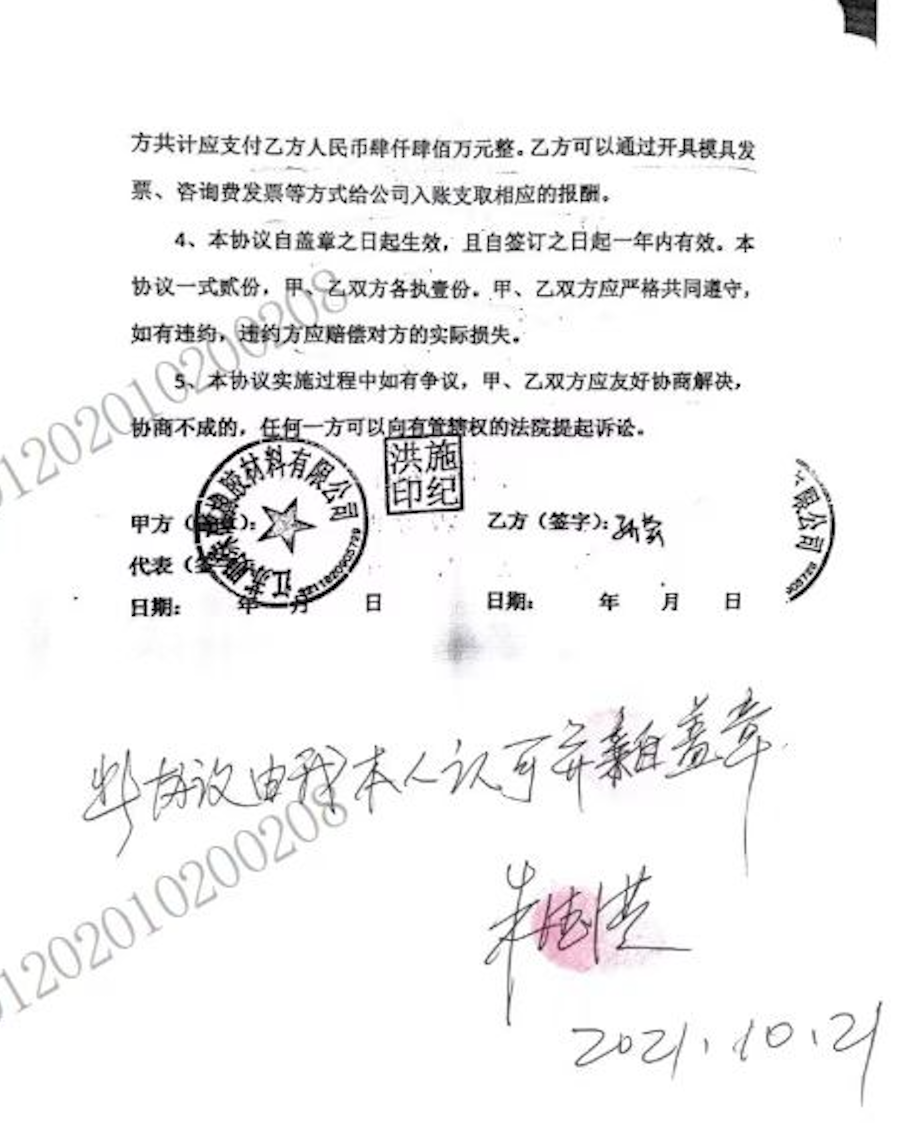 孙莹在庭审中表示,2020年8月,在将朱德洪交代的事做好后,她担心朱德洪不认账,于是就找他给书面的东西作为依据。“最终他和我签订了两份协议,协议的内容其实和我做的事情是不一样的,但为了有一个书面材料可以证明朱德洪承诺给我的费用,内容就按照朱德洪的要求写了。” 孙莹没有具体说明“我和做的事情是不一样的”,具体指什么事情。但根据法院的一审判决,可以知道孙莹在明珠公司的工作,除了正常的财务工作之外,就是找人虚开发票。