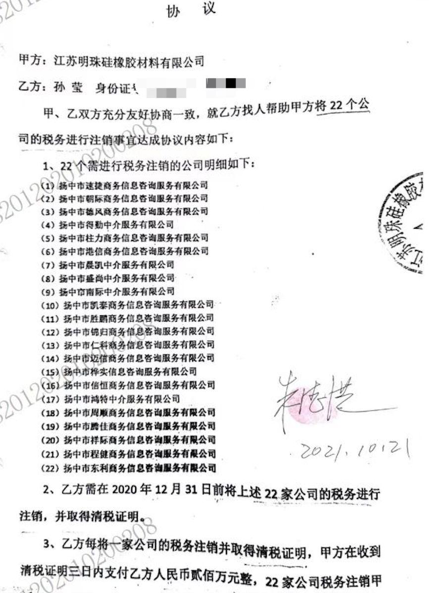 合同提供者是江苏明珠硅橡胶材料有限公司(以下简称,明珠公司)的前财务经理孙莹。“根据记者获得的协议显示,两份协议甲方均为明珠公司,乙方为孙莹。其中一份协议约定,孙莹将每将22家公司中的一家公司的税务进行注销,并取得清税证明,明珠公司就应支付孙莹200万元。”