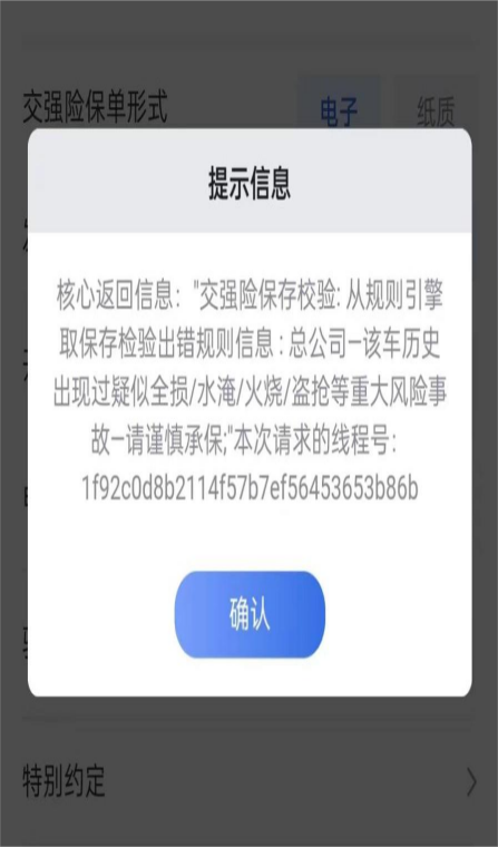 最近,到了买车险的时间了,奇怪的是该车根本就买不上保险,返回信息: “交强险保存校验:从规则引擎取保存检验出错规则信息:总公司-该车历史出现过疑似全损/水流/火烧/盗抢等重大风险事故一请谨慎承保。