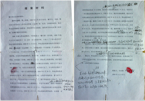 记者看到该《报案材料》为打印材料,上有10多处手写体的修改。其中字数最多的添加内容为:“本人认为,季永武行为,已触犯法律,涉嫌非法吸收公众存款,我到公安报案,追究其刑事责任,挽回本人被骗的钱。”该材料的落款日期为2009年5月18日。