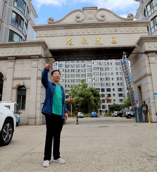 ▲图为宋长义在自己开发的小区门前,介绍这个小区原来叫“愉景豪苑”,被当地黑恶势力头目王育泉抢夺后,改名为“龙泉花园”。