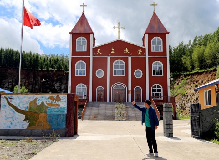 ▲图为宋长义介绍说,天主教堂原在团结路边上,为了拓宽东出口,县里让他垫资迁建到这个山坡。