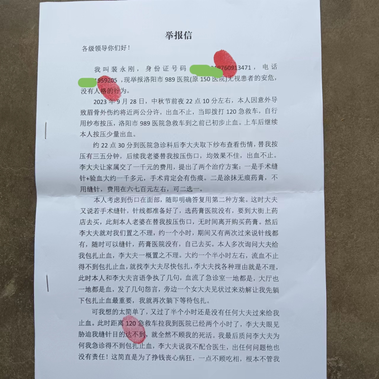 近日,我们接到河南洛阳市裴永刚先生的实名举报信,信中反映洛阳市989医院(原150医院)在患者到急诊室后,等了将近两个小时,迟迟得不到救治。举报信中的时间为2023年9月28日,中秋节前夜22点10分左右,因意外导致眉骨外伤约将近两公分许,出血不止,当即拨打120急救车,约22点30分救护车到达医院急诊科后,有一个姓李的大夫取下纱布查看伤情,替我按压有三五分钟,后续由裴先生的夫人按压伤口,均效果不佳,出血不止。李大夫让家属交了一千元的费用,提出了两个治疗方案:一是手术缝针+验血大约一千多元,手术肯定会有伤痕。二是涂抹无痕药膏,不用缝针,费用在六七百元左右,可二选一。