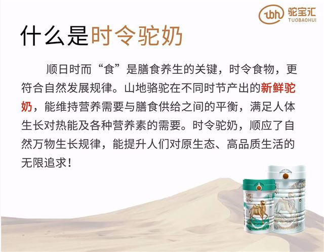 驼宝汇始终坚持“道法自然·品行天下”的立司原则,还在驼奶行业率先推出了“山地驼奶”新流派,保持“时令特色”,给“双峰壹号”品名注入了新内涵,给复杂的驼奶市场带来了新气象。