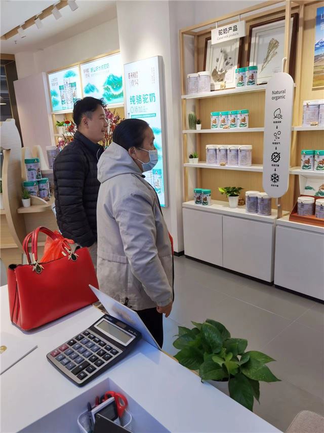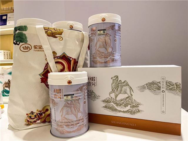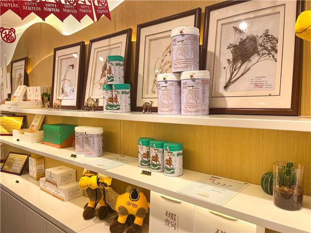 走进店内,环境布局典雅,“大叶补血草”、“阿魏”、“苦参”等几幅来自新疆阿尔泰山脉的药用植物标本,与“双峰壹号”纯驼奶粉系列产品交辉映照,显得别有一番山地情调。