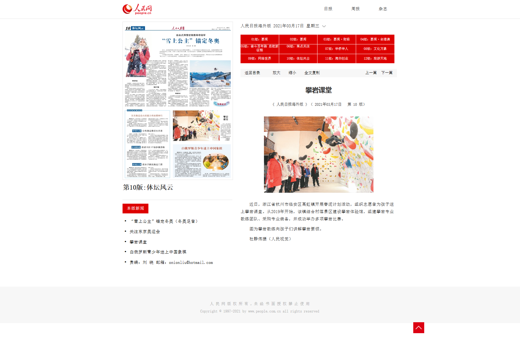 近日,浙江省杭州市临安区高虹镇开展春泥计划活动,组织志愿者为孩子送上攀岩课堂。从2019年开始,该镇结合村落景区建设攀岩体验馆,组建攀岩专业教练团队、采购专业装备,并成功举办多项攀岩比赛。