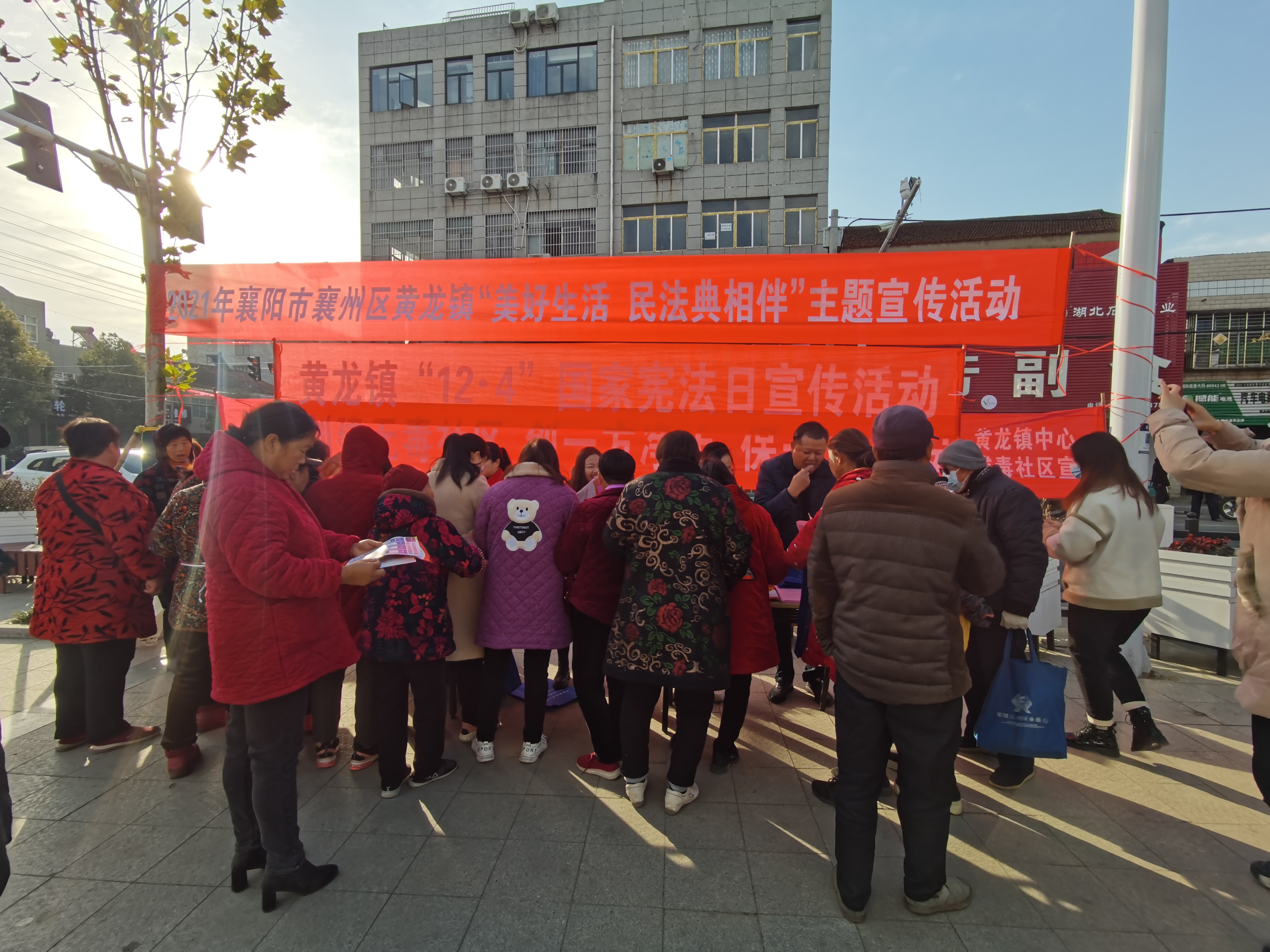 三农融媒湖北襄阳讯(通讯员 杨涛)12月1日,革命老区湖北襄阳黄龙镇宣传办、综治办、派出所、文化站、法律服务中心、司法所、市场监管所、城建办、禁毒办、自规所等单位组织专班在该镇车站广场拉起横幅,支起宣传桌,向过往居民和行人普及法律知识。并现场发放民法典法律知识、社区矫正法教育宣传图册、打击防范电信诈骗手册、远离毒品宣传册、防范邪教、平安建设倡议书等宣传资料1000余份,宣传礼品袋200多个,宣传围裙200余件,现场解释政策20余次。由此拉开了“12.4”宪法宣传周活动序幕。