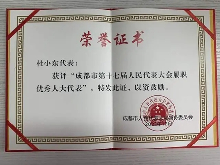 共工日报社四川12月23日电(龚国林/胡城)2022年12月19日,为激励先进、营造学习先进的良好氛围,更好发挥代表主体作用,成都市人民代表大会常务委员会经研究决定,对成都市第十七届人民代表大会履职优秀人大代表进行通报表扬,四川盛豪律师事务所董事会主席、成都市人大代表杜小东律师获评“成都市第十七届人民代表大会履职优秀人大代表”。