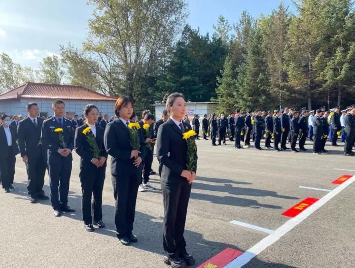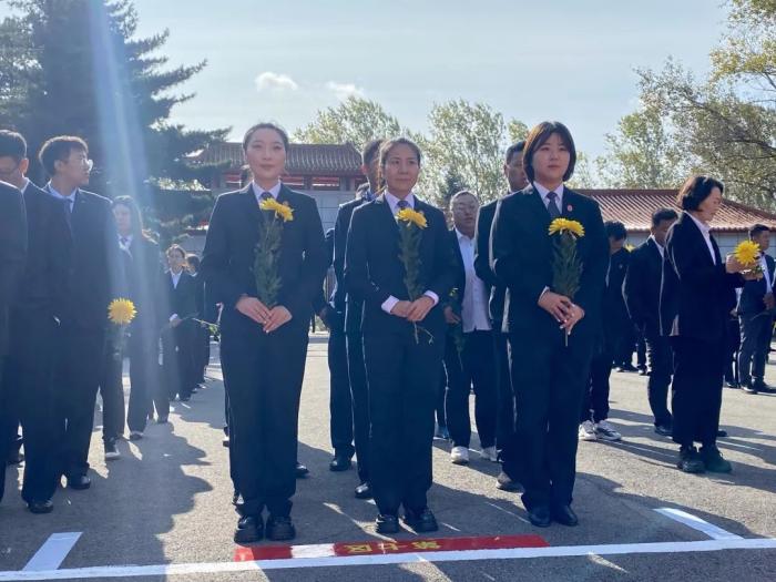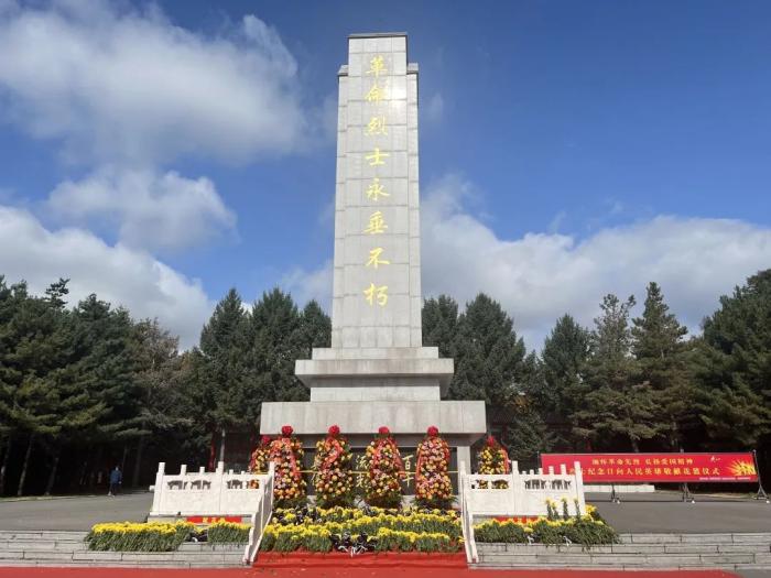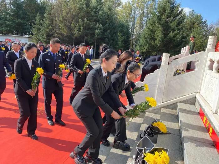 巍峨墓碑下,功勋卓越;青松绿柏中,英气凛然。雄壮的国歌响起,祭奠仪式正式开始,东北抗联的铁骨忠魂,抗美援朝的热血丰碑,峥嵘岁月的一幕幕在脑海中浮现。参祭干警齐聚烈士纪念碑前,瞻仰烈士纪念碑,追思先烈功绩,向纪念碑默哀并敬献花束。