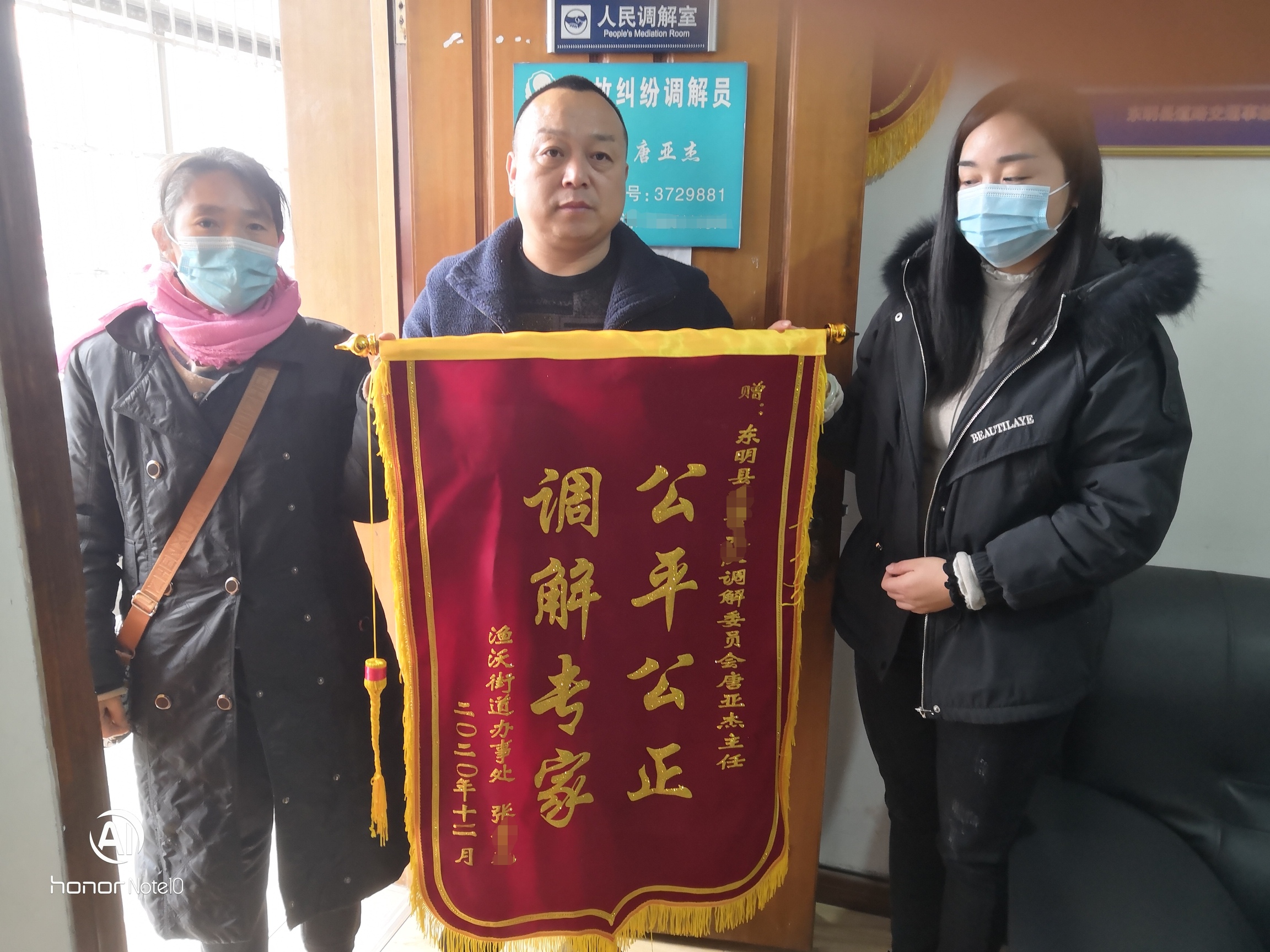 受理此案的山东省菏泽市东明县人民法院道路交通事故纠纷调解委员会主任唐亚杰经过详细了解此次交通事故的前因后果随即开展交通事故双方思想工作,绕之一理,动之以情劝解双方互相理解性看待问题,经过唐亚杰一个多月来三番五次往返事故双方家庭苦口婆心劝解,事故双方逐渐打开心结,终于于日前事故双方达成合解,赔偿金额事故双方都满意。唐亚杰的精心劝解感动事故双方多次邀请唐亚杰聚餐饮酒都被唐亚杰婉言谢绝。实在过意不去真心想感谢唐亚杰的张女士特制作绣有“公平公正,调解专家”锦旗于日前专程送给唐亚杰。( 万友)