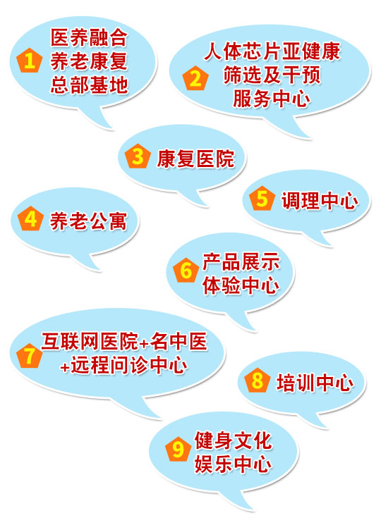 医养融合康复基地秉承“食在广州、吃出健康”的发展理念,以花都为中心,将在各大养老院、社区、颐康中心等植入医养融合健康新零售平台,联合疾控中心专家、暨南大学专家、中医药学院专家、南方医科大学专家等共同研发系列特膳食品,包括血管清道夫(清调补)、肠道菌群平衡、肾脏功能、提升免疫力、减重、降血压、降血糖、降尿酸、降血脂等,满足人体健康需求。