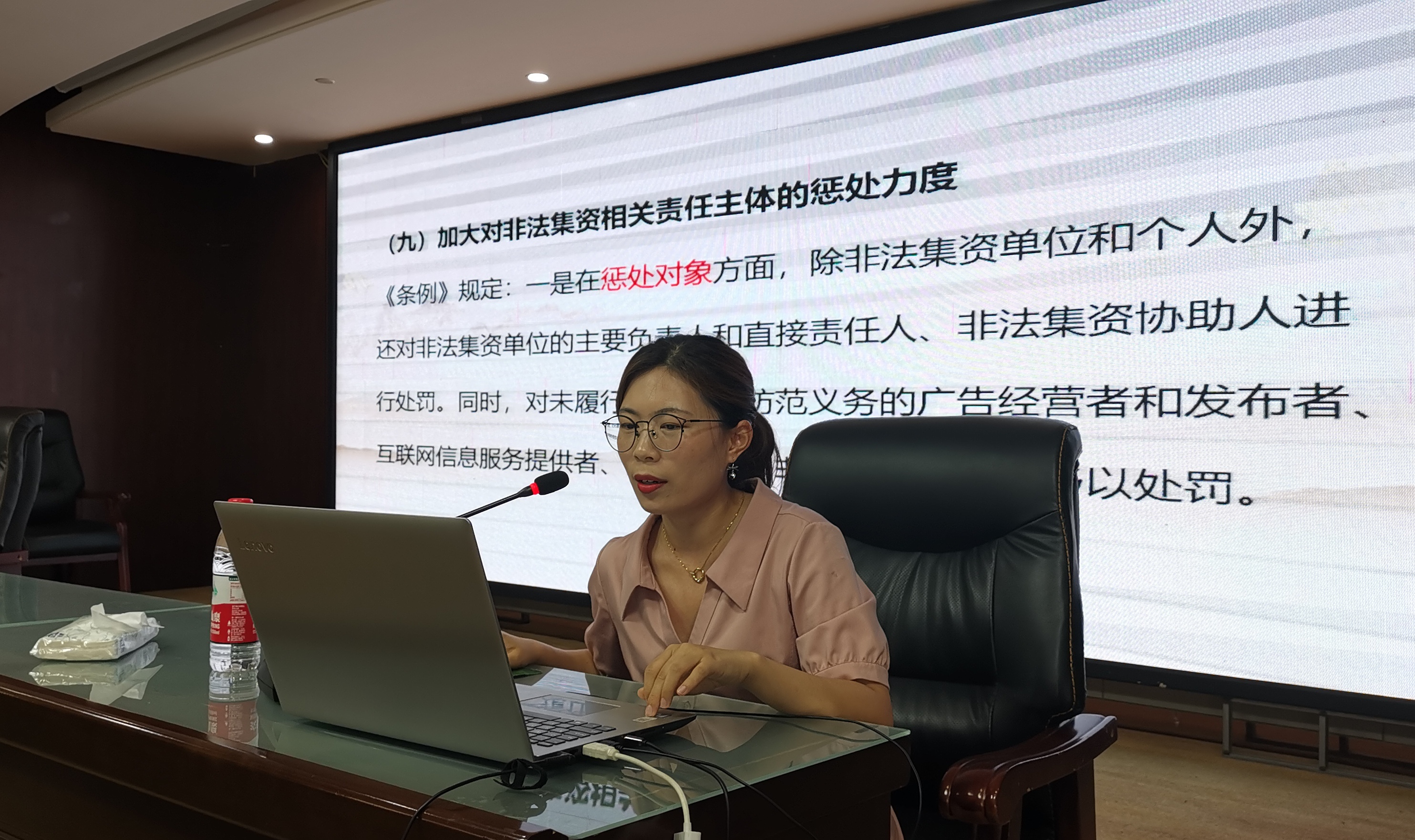 培训会上,邀请区法院程前法官以专业执法人的角度,列举社会生活中大量的非法集资典型案例,特别是对身边人、身边事的典型案例剖析,为全区财政干部解读了《防范和处置非法集资条例》,宣讲了有关的法律法规条款内容,教育引导财政干部提高学法守法用法的意识,积极发挥财政干部知法护法的职能优势,坚决打击非法集资犯罪行为。