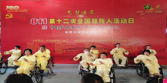 图为:东莞市肢残人协会文体工作委员会残疾人表演《轮椅太极》