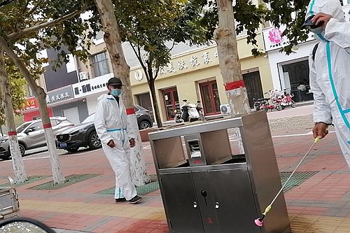 环卫工人每天身穿防护服,佩戴口罩、眼罩、手套对垃圾桶、果皮箱先用消毒液消毒,再用强力去污剂进行擦拭,擦拭干净后再进行一次消毒,确保做好垃圾桶的消杀工作。