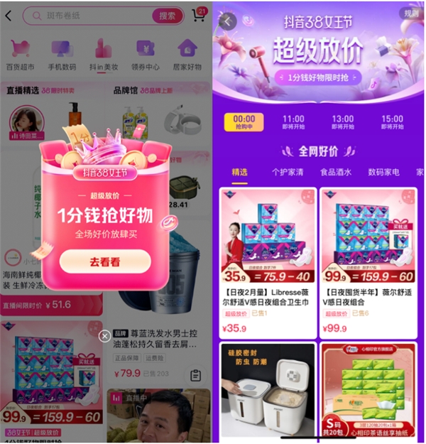 在传统线下零售场景中,38节营销节点本就是女性护理品牌的必争之地,本次「抖音38节」个护家清鲜花行业也将女性护理品类作为重点扶持对象,从货品、流量等维度予以扶持,不仅结合抖音电商兴趣好物特点,推出平台专属组合货品;还延长品牌旗舰店自播时间,增加福袋、秒杀等互动玩法,着力提升直播间互动及转化。
